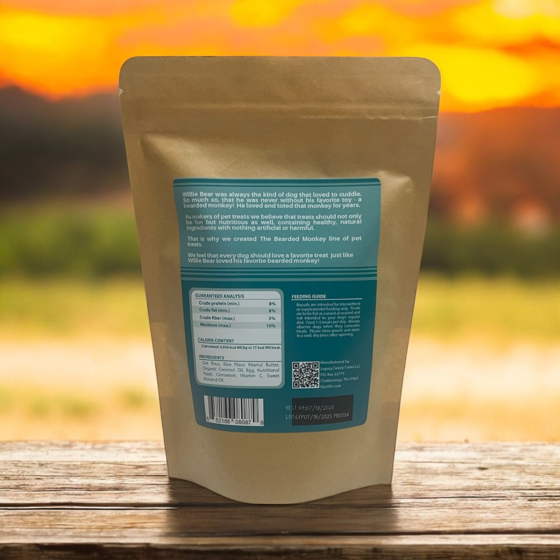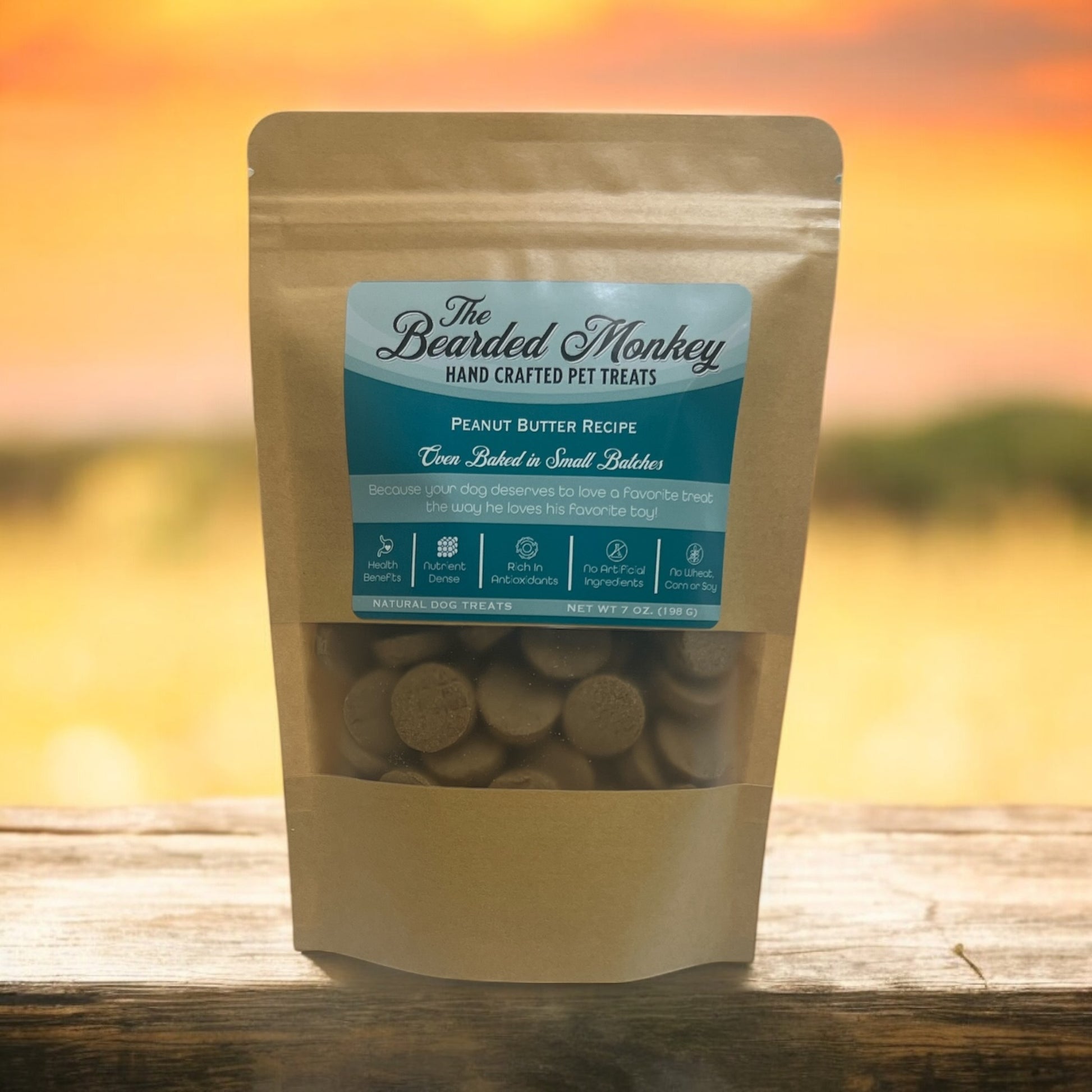 The Bearded Monkey line of pet treats is designed to give your dog a wholesome all natural baked treat that he will find irresistible. Homemade and handcrafted in small batches ensures the best product possible. The Peanut Butter flavor is an excellent choice with antioxidants for immune health and healthy whole grains for added fiber. An excellent choice for snacking, training or rewarding behavior. 7 oz